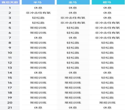如果你尚未找到符合自己的恢复时间表,并且希望在完成半程马拉松、马拉松或超级马拉松后尽快准备好以重返训练,你可以参考这个时间表。