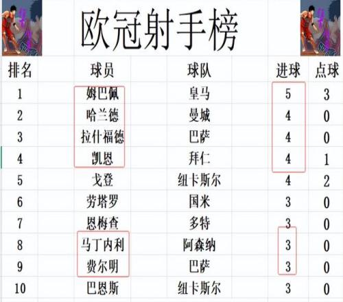 射手榜方面,姆巴佩5球继续稳居榜首,哈兰德,戈登破门,拉什福德双响,三人追上凯恩4球并列第2。费尔明上演帽子戏法,和劳塔罗,恩梅查,马丁内利等人将前十门槛提高到3球。