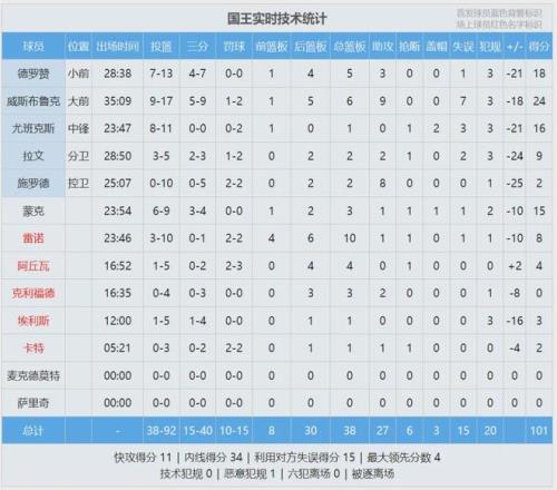 下半场雷霆对威少针对性防守,一突破就有2-3人包夹,切断他的传球路线,导致威少失误增多。威少本场正负值-18,已经是国王首发当中最高的。NBA杯除了决赛,其余也算常规赛战绩。雷霆9胜1负领跑联盟,国王3胜6负西部第12。