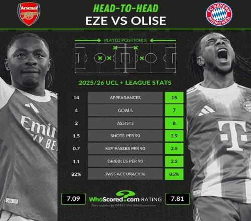 知名数据网站“WhoScored”对比昔日水晶宫双星埃泽、奥利塞本赛季关键数据,后者均占优。今日凌晨,阿森纳将与拜仁在欧冠相遇,两人将展开直接对话。
