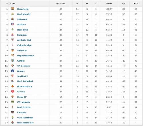 皇马在2025年比巴萨多踢了一场西甲,战绩为27胜5平6负,比巴萨少了10分。比利亚雷亚尔战绩第三,马竞第四,贝蒂斯第五。塞维利亚与皇家社会两支劲旅状态不佳,排在后半区。在打满全年比赛的17支非升班马和降级队中,赫罗纳战绩最差,只拿到31分。