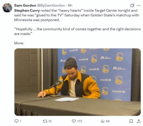 库里在赛后也回答了很多记者的问题,他谈到了自己膝盖的问题,他表示:昨天来到这里训练时就感觉膝盖有些怪怪的,但打完了比赛感觉膝盖还行,我决定利用这个夜晚的休息来恢复它,如果一切顺利的话我计划出战背靠背的第二场。