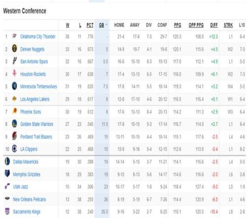 目前西部准确的排名情况:雷霆、掘金、马刺、火箭、森林狼、湖人、太阳、勇士、开拓者、快船、独行侠、灰熊、爵士、鹈鹕、国王。