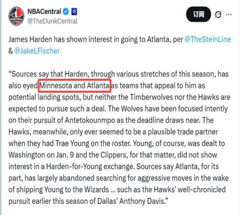 消息源透露,本赛季多个阶段里,哈登都将森林狼与老鹰视为心仪的潜在下家,但森林狼与老鹰两队预计都不会推进相关交易。